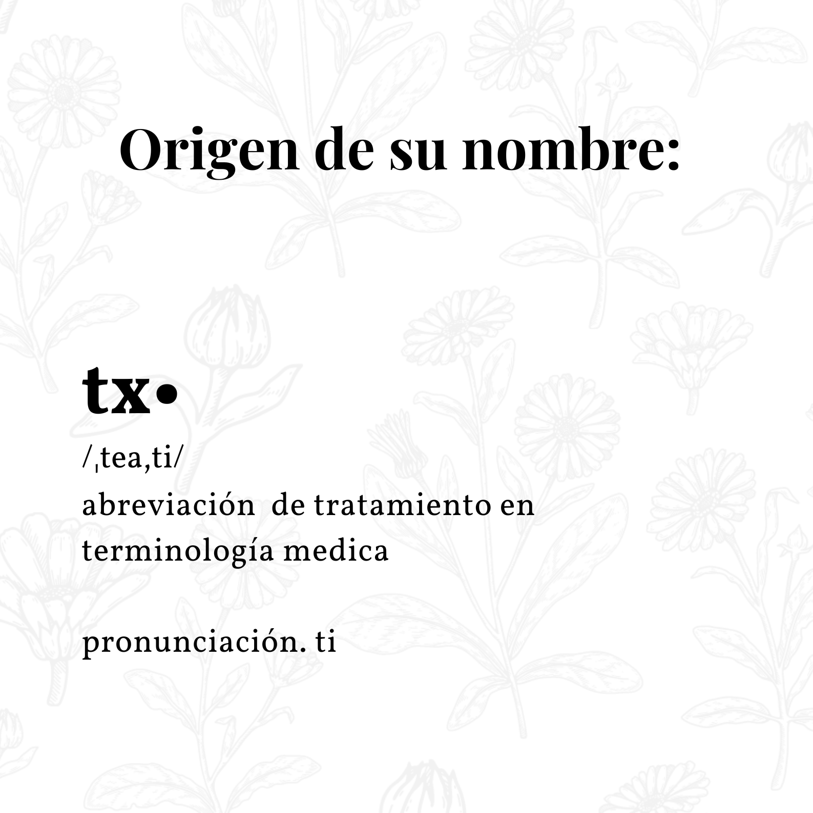 Se escribe Tx como la abreviatura de tratamiento en el campo de la salud, conmemorando mi profesión como enfermera y técnico de farmacia. El Botanicals acentúa lo botánico, lo natural, representando la naturopatia.